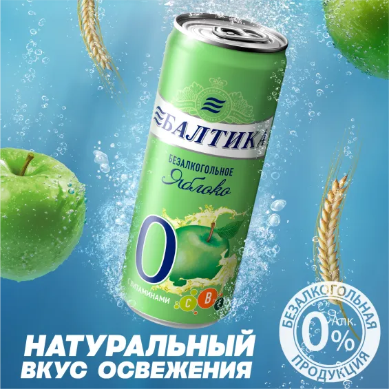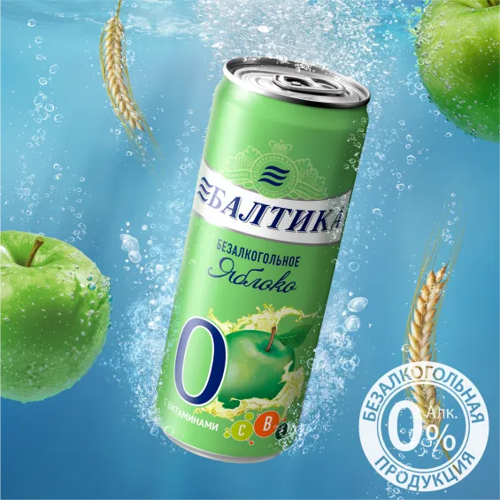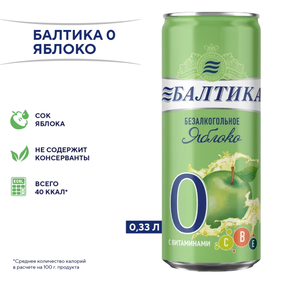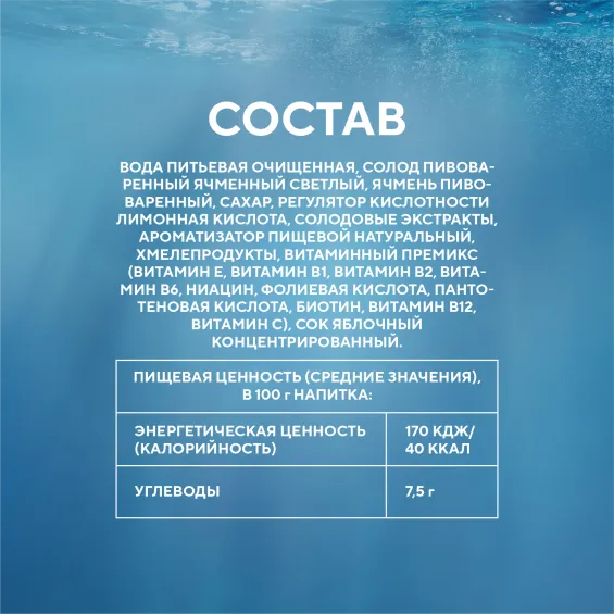 вода питьевая очищенная, солод пивоваренный ячменный светлый, ячмень пивоваренный, сахар, регулятор кислотности лимонная кислота, солодовые экстракты, ароматизатор пищевой натуральный, хмелепродукты, витаминный премикс (витамин Е, витамин В1, витамин В2, витамин В6, ниацин, фолиевая кислота, пантотеновая кислота, биотин, витамин В12, витамин С), сок яблочный концентрированный.