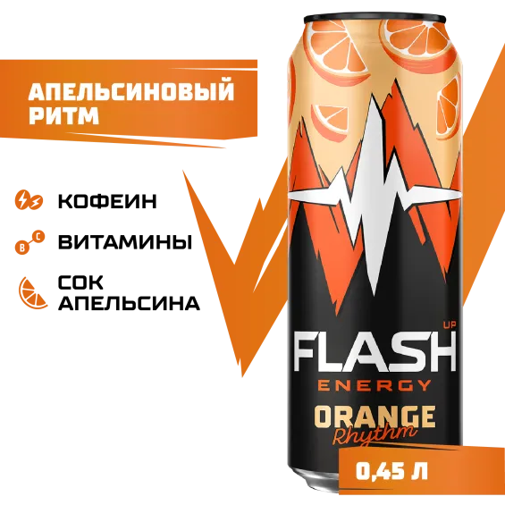 Вода питьевая очищенная, сахар, вкусо-ароматическая основа «Апельсиновый ритм» (таурин, ароматизатор, витамин C, кофеин, ниацин, пантотеновая кислота, бета-каротин, витамин B6, фолиевая кислота), регулятор кислотности кислота лимонная, антиокислитель кислота аскорбиновая, сок концентрированный апельсиновый, консерванты: сорбат калия и бензоат натрия