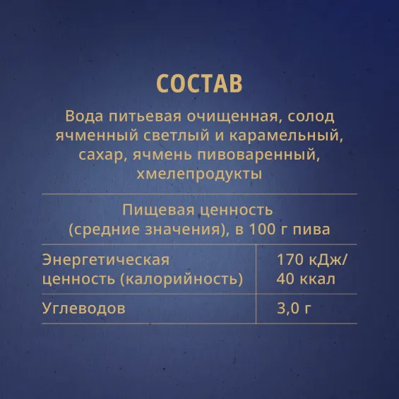 вода питьевая очищенная, солод ячменный светлый и карамельный, сахар, ячмень пивоваренный, хмелепродукты.
