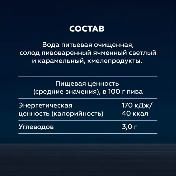 вода питьевая очищенная, солод пивоваренный ячменный светлый и карамельный, хмелепродукты.