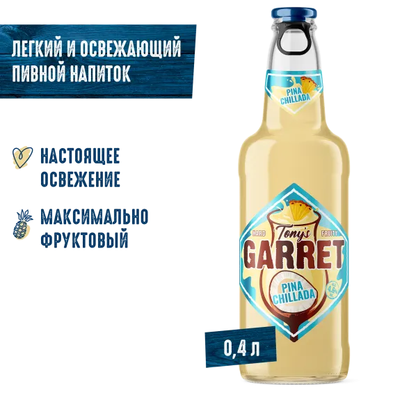 вода питьевая очищенная, солод пивоваренный ячменный светлый, сахар, ароматизатор пищевой эмульсионный «Ваниль» (стабилизаторы: E414, E444, E445, регулятор кислотности Е330, консерванты: Е202, Е211), регулятор кислотности кислота лимонная, ароматизатор пищевой «тип Пина Колада», ароматизатор пищевой «Ананас», сок концентрированный из ананаса, хмелепродукты.