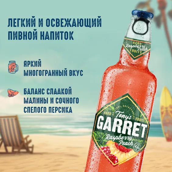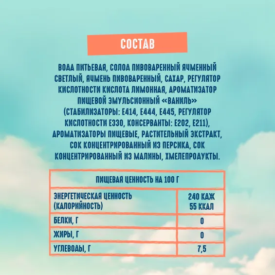 вода питьевая очищенная, солод пивоваренный ячменный светлый, сахар, регулятор кислотности лимонная кислота, ароматизатор пищевой эмульсионный «Ваниль» (стабилизаторы: E414, E444, E445, регулятор кислотности Е330, консерванты: Е202, Е211), ароматизаторы пищевые, растительный экстракт, сок концентрированный из персика, сок концентрированный из малины, хмелепродукты